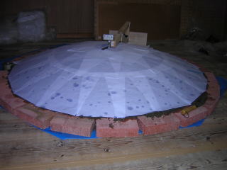 持ち運びと出力(集光力)の関係から、直径1.5m、焦点距離0.8mのパラボラを作って見ることにした。